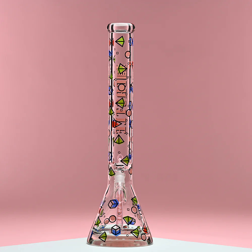 The Castle Glassworks 18" Shapes Beaker is a statement piece that blends bold geometric aesthetics with top-tier functionality. Crafted from thick borosilicate glass, this 18-inch tall beaker bong features intricate shape-themed etchings, adding a unique artistic touch to its classic design.