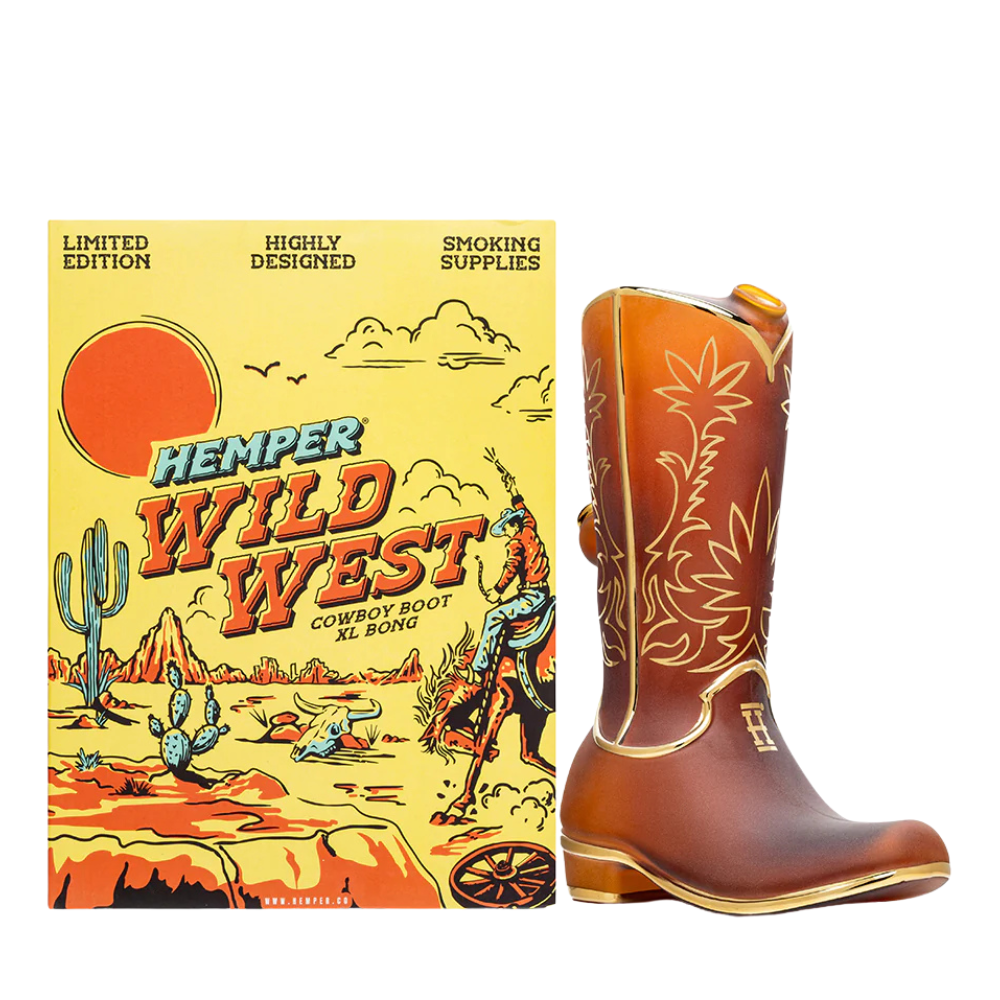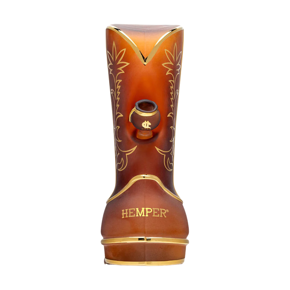 Step into legendary seshes with the Hemper Wild West Cowboy Boot XL Bong — a bold, show-stopping piece shaped like a classic Western boot. Designed with intricate gold detailing, rich brown hues, and a high-gloss frosted amber finish, this bong perfectly blends eye-catching artistry with top-tier functionality.